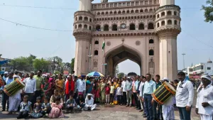 Hyderabad: The iconic Charminar witnessed a vibrant cultural moment on Thursday morning, April 23, as a group of tribal visitors brought colour and rhythm to