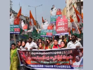 Hyderabad: Demanding an immediate reduction in the commercial LPG cylinder prices, female workers of the Congress party donned masks with union minister Smriti Irani on