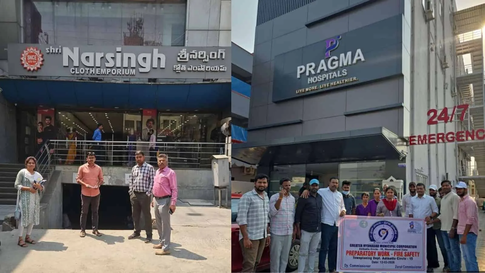 The inspections, conducted by GHMC’s Town Planning Wing as part of the state government’s 99-day Praja Palana–Pragathi Pranalika initiative, focused primarily on commercial establishments along major roads, reviewing compliance with fire safety norms and existing safety infrastructure.