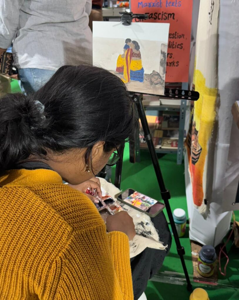 The stall is also selling thought-provoking art from the Progressive Artists’ League. Adding to the experience was a live painting session by an artist present at the stall. As visitors browsed through books, the artist worked quietly, painting scenes in real time. The live art is not for sale, but simply to allow people to witness the process.