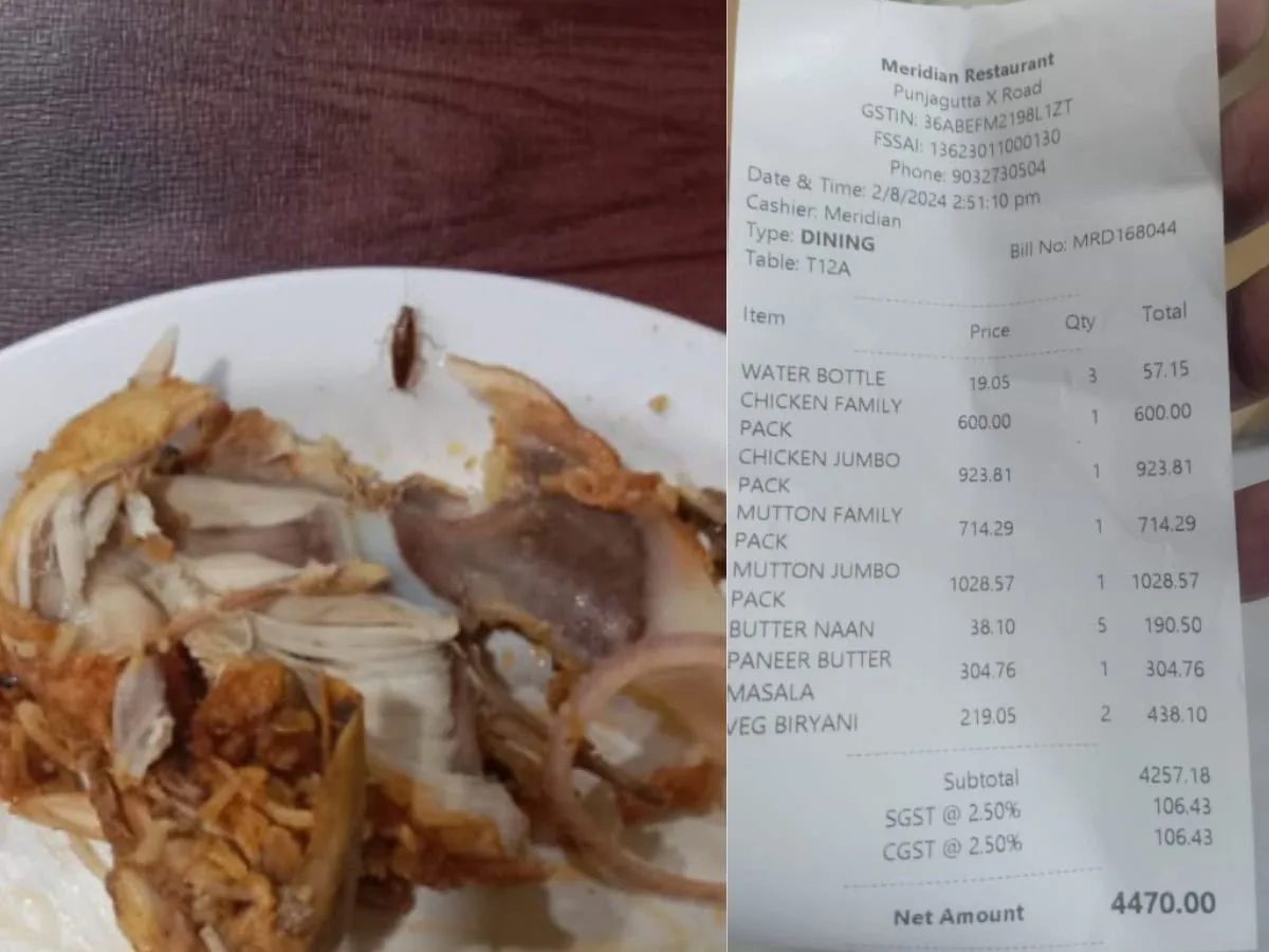 Hyderabad: In yet another case of hygiene concerns at city restaurants, Meridian Restaurant in Punjagutta is under scrutiny following an alarming social media post raising concerns regarding food hygiene at famous restaurant in Hyderabad as a cockroach was spotted in chicken biryani.