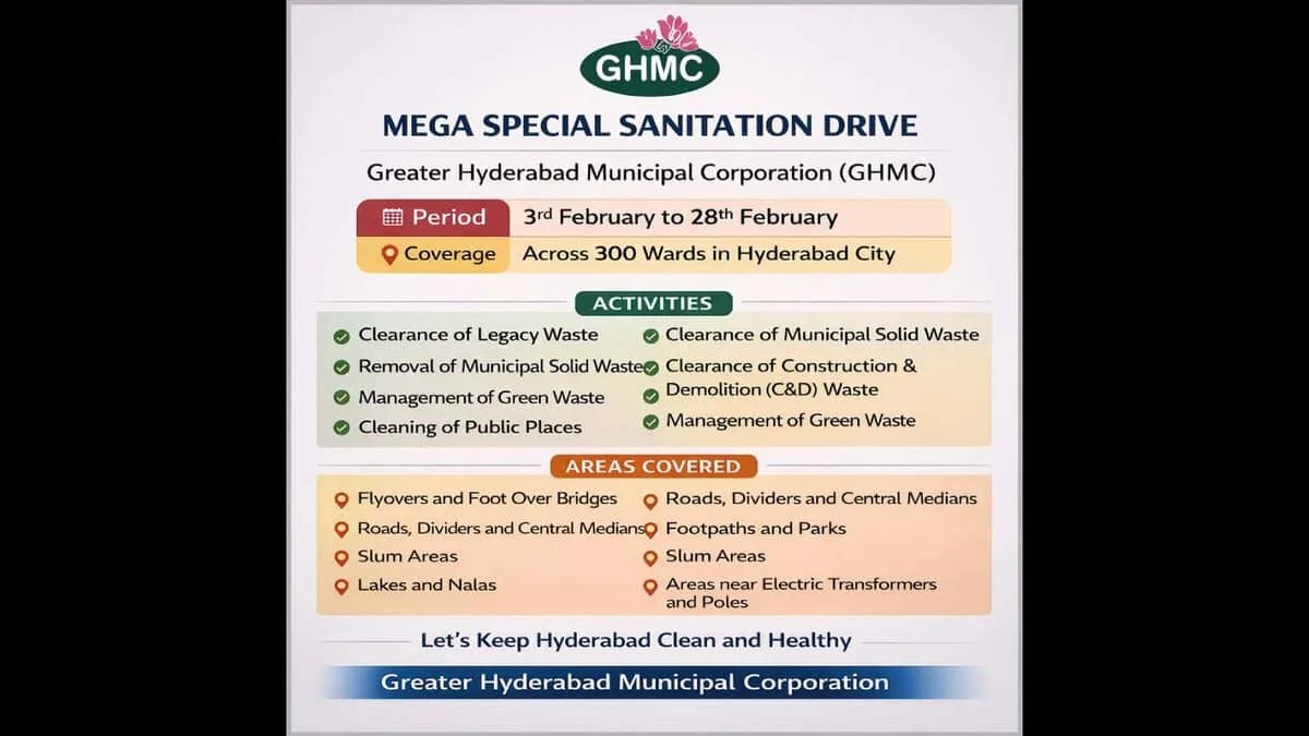 Hyderabad: The Greater Hyderabad Municipal Corporation (GHMC) on Tuesday, February 3, launched a 26-day-long sanitation drive in the city, focusing on removing municipal waste, green waste and waste generated due to engineering and biodiversity work across 300 wards in Hyderabad.