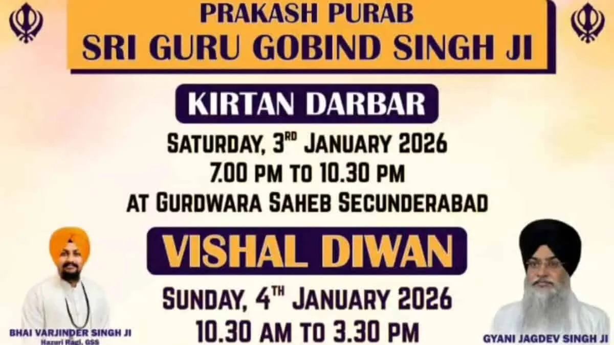 The GSS Prabhandak Committee, which organises the local Sikh events in Telangana, led by its President S Baldev Singh Bagga, confirmed in a statement that the event will take place between 10:30 am and 3:30 pm on Sunday with grandeur to mark the holy celebrations for the tenth and last Sikh Guru Gobind.