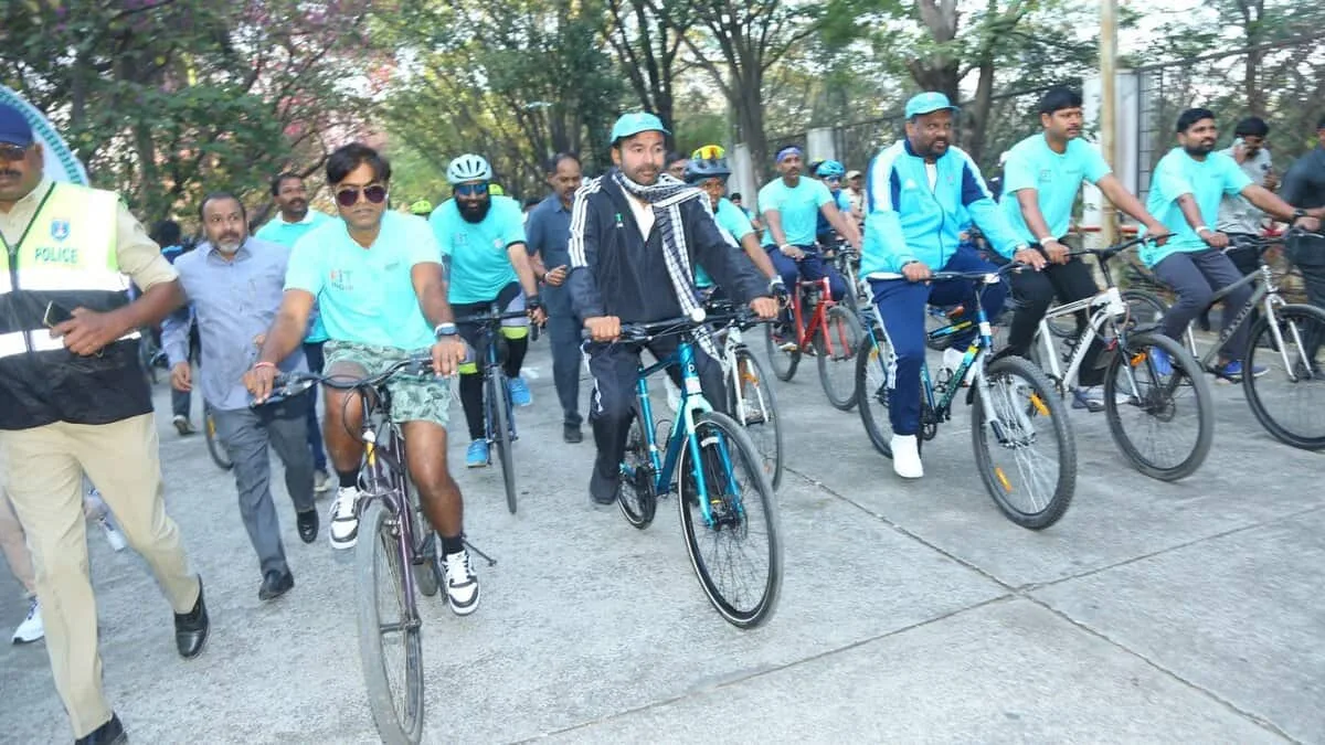 The event featured a mass cycling rally of approximately six kilometres, starting and concluding at Gachibowli Stadium, along with fitness demonstrations such as yoga, warm-up exercises, and community engagement activities.
