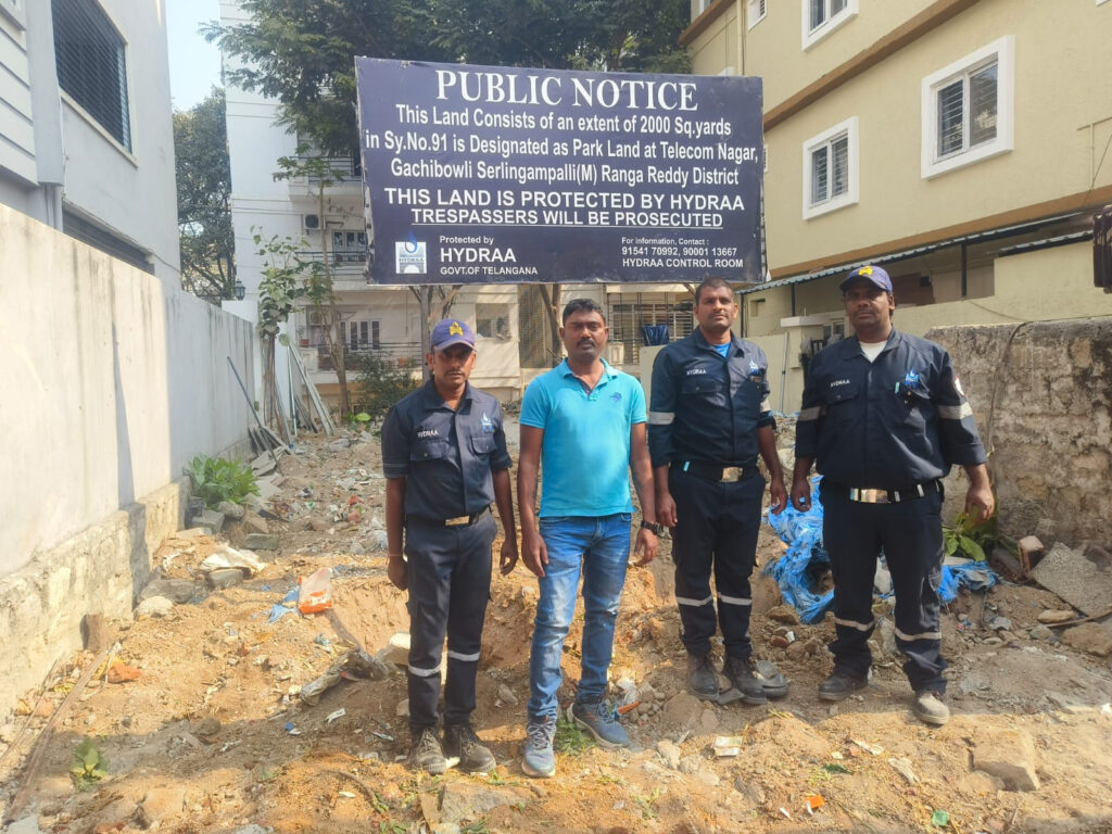 After a field-level investigation and consultations with the Greater Hyderabad Municipal Corporation (GHMC) and the Revenue Department, HYDRAA removed a shed that had been erected in the space and set up fencing. Boards were also erected to indicate that the park is protected by HYDRAA.