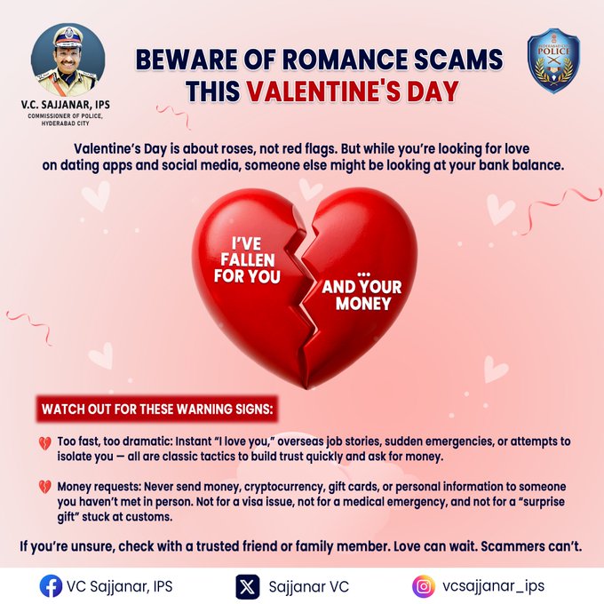 “Valentine’s Day is about roses, not red flags. But while you’re looking for love on dating apps and social media, someone else might be looking at your bank balance,” Sajjanar said in an X post.