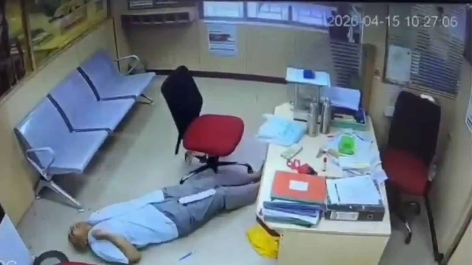 Closed circuit television (CCTV) camera footage of the incident shows the man sitting at a desk with his documents when he suddenly starts to feel uneasy. As the woman sitting behind him gets up and goes out of the room, the man collapses from his seat and falls to the ground.