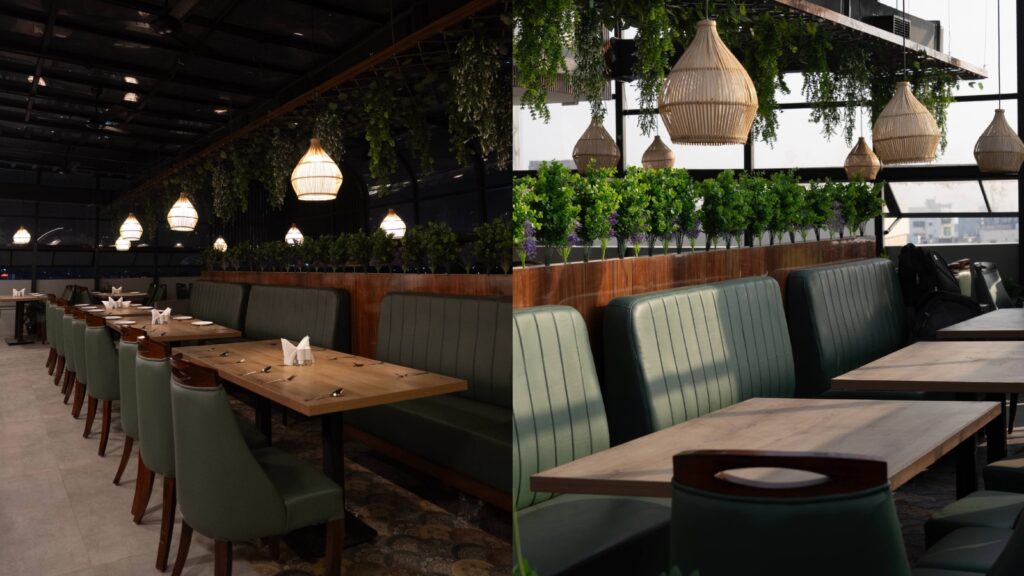 The ambience plays an equally important role in this new chapter. The rooftop space is airy and thoughtfully designed, with comfortable seating, warm lighting and plenty of greenery softening the metal-and-glass structure. Hanging planters, wicker lamps and muted tones lend the space a relaxed, contemporary feel.