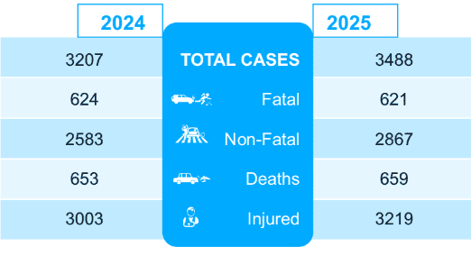While fatal accidents saw a marginal decline from 624 cases in 2024 to 621 in 2025, non-fatal accidents trended upward, reaching 2,867 cases and surpassing the previous year’s figures.