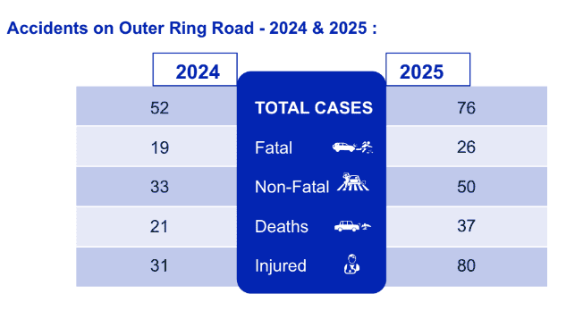 The Outer Ring Road (ORR) witnessed a significant surge in traffic incidents in 2025, with total accidents rising to 76 from 52 the previous year. Of these, 26 were classified as fatal and 50 as non-fatal.