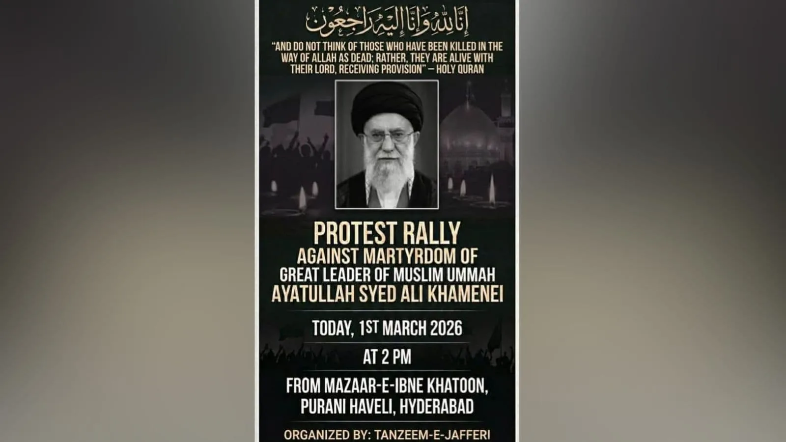 Hyderabad: Tanzeem-e-Jafferi, a prominent Shia religious and socio-political organisation based in Hyderabad, on Sunday, March 1, announced a protest rally in Old City, condemning the killing of Iran’s Supreme Leader Ayatullah Syed Ali Khamenei.