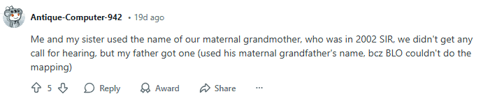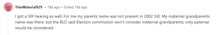 A person on Reddit wrote, “For me, my parents’ names were not present in the 2002 SIR. My maternal grandparents’ names were there, but the BLO said the Election Commission won’t consider maternal grandparents, only paternal would be considered.”