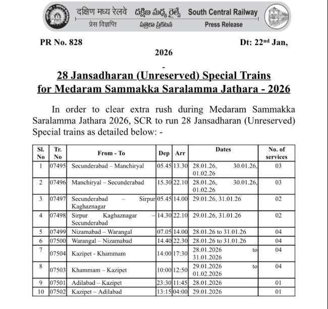 Hyderabad: To manage the rush of pilgrims at the Medaram Jatara taking place at Mulugu in Telangana between January 28 and 31, the Telangana State Road Transport Corporation (TGSRTC) and the South Central Railway (SCR) will be operating additional buses and special services trains.