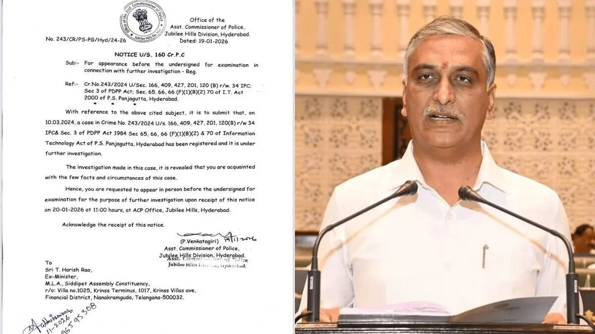 Hyderabad: The Telangana Police Special Investigation Team (SIT) on Monday, January 19, issued a notice to Bharat Rashtra Samithi (BRS) leader Harish Rao to appear before the Jubilee Hills Police Station in Hyderabad on Tuesday, January 20, in connection with a phone tapping case in which the then K Chandrasekhar Rao (KCR)-led BRS government has been accused of using police machinery to monitor the phone conversations of Opposition leaders during the 2023 Telangana Assembly elections.