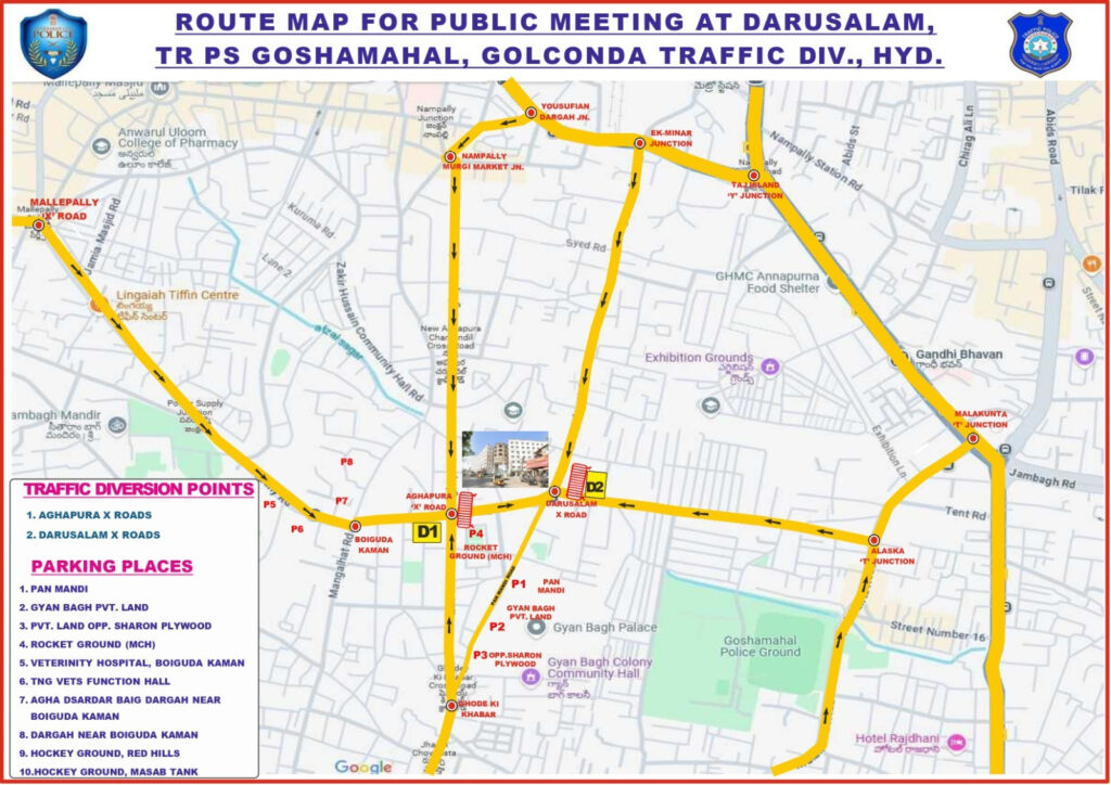 - Traffic coming from Mallepally X Road, Boiguda Kaman, Mangalhat towards Darussalam will be diverted at Aghapura X Road towards Takkarwadi and Chaar Kandil.