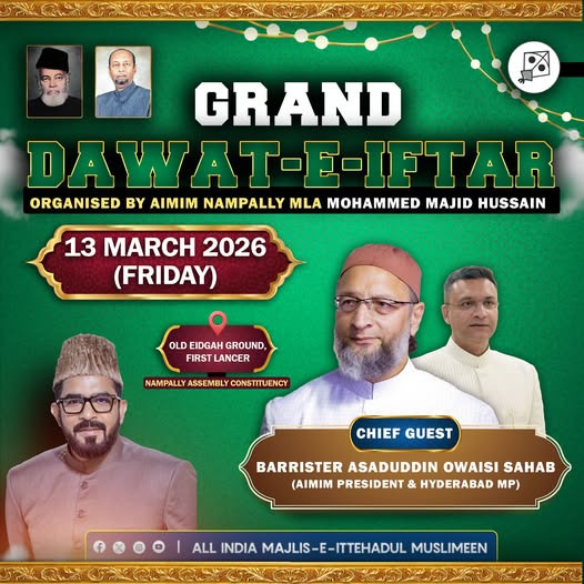 AIMIM has organised a Dawat-e-Iftar on March 13 at Old Eidgah Ground, First Lancer in Nampally Assembly Constituency which party president Asaduddin Owaisi will be attending.