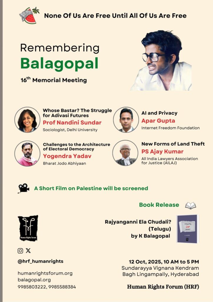 Additionally, the event will include a screening of a short film on Palestine and the release of a Telugu book, “Rajyanganni Ela Chudali?” by K Balagopal, aimed at continuing his intellectual and human rights legacy.