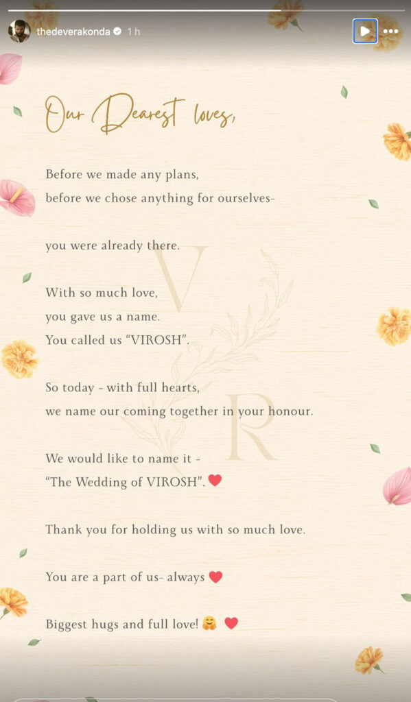 Hyderabad: It is all about ‘Virosh’ across social media and the internet right now. Rashmika Mandanna and Vijay Deverakonda have officially announced that they will tie the knot on February 26, 2026. The actors confirmed the happy news themselves last night, putting an end to years of speculation about their relationship. The wedding will take place at the luxurious The Mementos by ITC and is expected to be a highly private and intimate affair.