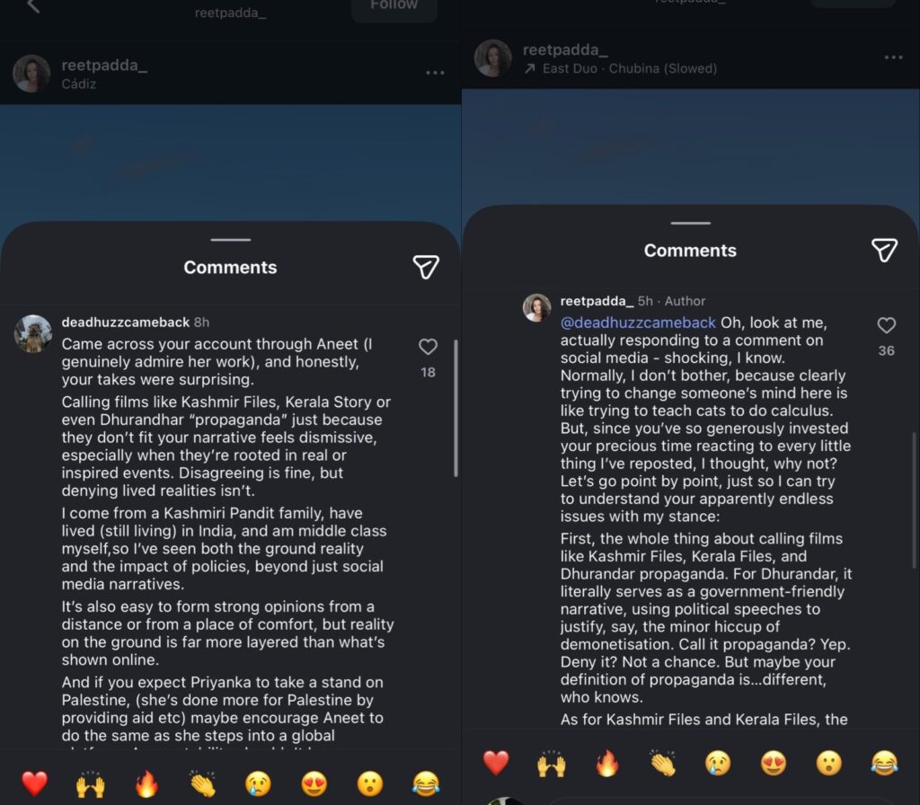 Aneet’s sister had labelled the above-mentioned films as “propaganda,” sparking a massive debate online. While some supported her candid opinions, a large section of users criticised her views, leading to intense trolling. The situation escalated further when her Instagram activity and comments began circulating widely, drawing attention not just to her but also to her sister Aneet.