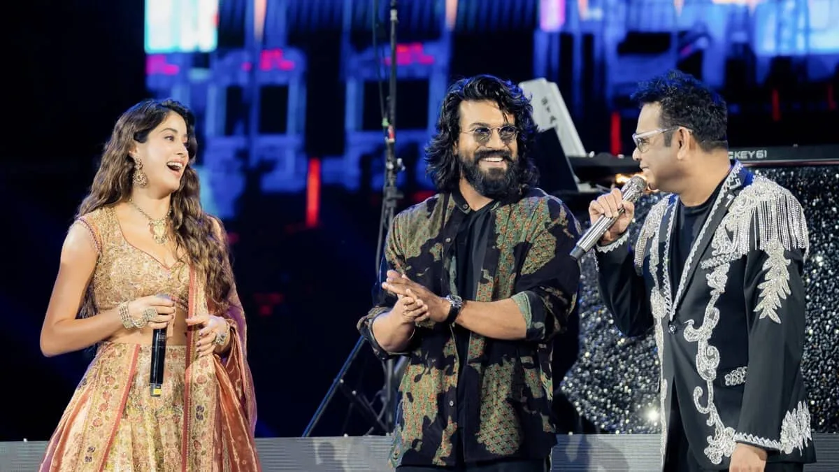 Just when fans thought the concert couldn’t get any better, the evening took a surprising turn. Superstar Ram Charan and actress Janhvi Kapoor made a special appearance on stage, leaving the audience screaming in joy. Their surprise entry lit up the stage as Rahman welcomed them with a warm smile. Videos of the trio on stage went viral within minutes, flooding social media with excitement and admiration.