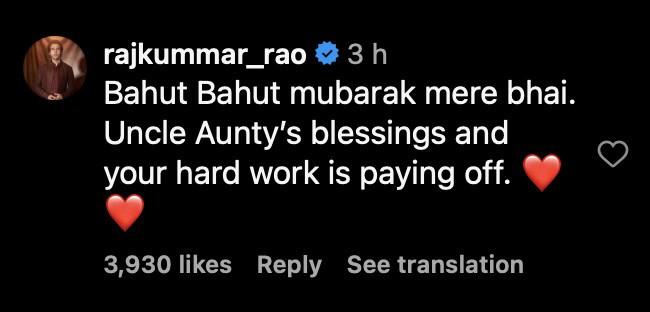 After Bhuvan shared the news, many stars and fans congratulated him. Rajkummar Rao commented, “Bahut Bahut mubarak mere bhai. Uncle Aunty’s blessings and your hard work are paying off.”