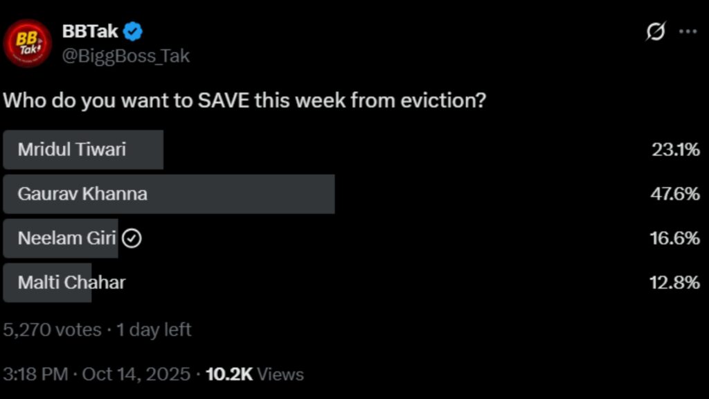 Adding to the suspense, there is a buzz of a possible mid-week eviction, as this weekend’s elimination may be postponed due to Diwali celebrations. However, the makers have not confirmed anything yet.