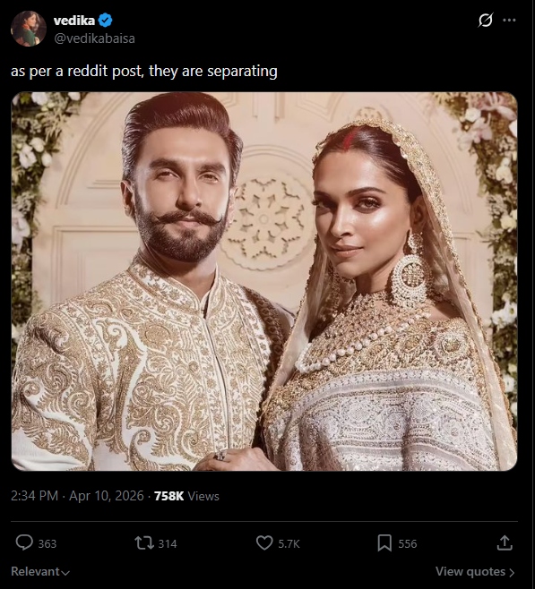 As often seen in today’s digital age, even a single social media post can snowball into a major discussion. Something similar happened recently when a tweet featuring Deepika and Ranveer’s photo went viral, claiming, “As per a Reddit post, they are separating.”