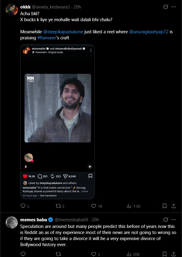 The rumours also gained traction after Deepika did not initially react to Ranveer Singh’s recent success with Dhurandhar 2, even as several Bollywood celebrities praised him. This led to online chatter, though Deepika later addressed the situation and clarified that she had watched the film.