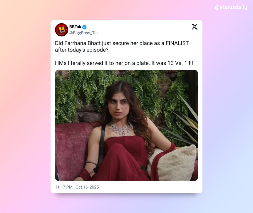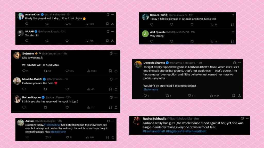 One viewer wrote, “Tonight totally flipped the game in Farrhana Bhatt’s favor. When it’s 13 vs 1 and she still stands her ground, that’s not weakness that’s power. The housemates’ overreaction and filthy behavior just earned her massive public sympathy. Wouldn’t be surprised if this episode just made her a finalist for sure.”