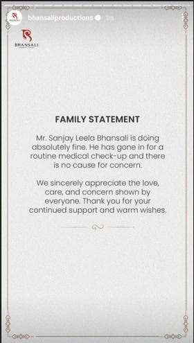 His family also issued a statement assuring fans that the filmmaker is in good health. “Mr. Sanjay Leela Bhansali is doing absolutely fine. He has gone in for a routine medical check-up and there is no cause for concern. We sincerely appreciate the love, care and concern shown by everyone,” the statement read.
