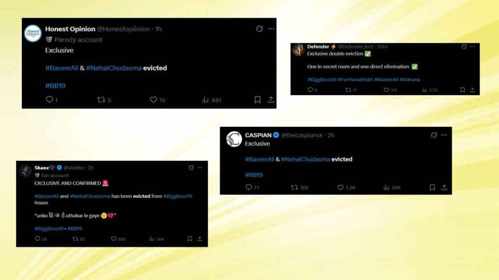 Mumbai: Social media is buzzing with updates and speculations about this week’s elimination in Bigg Boss 19. Contestants Pranit More, Nehal Chudasama, Baseer Ali, and Gaurav Khanna were on the chopping block in week 9.