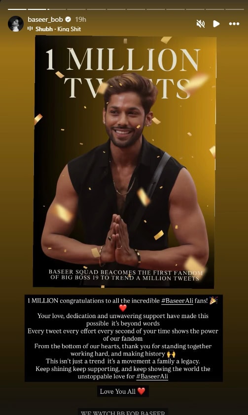 Baseer Ali has officially become the first Bigg Boss 19 contestant to cross 1 million tweets on X (formerly Twitter), surpassing all others by a huge margin. The tagline “We watch BB for Baseer” dominated the platform on Sunday, proving his growing popularity among fans.