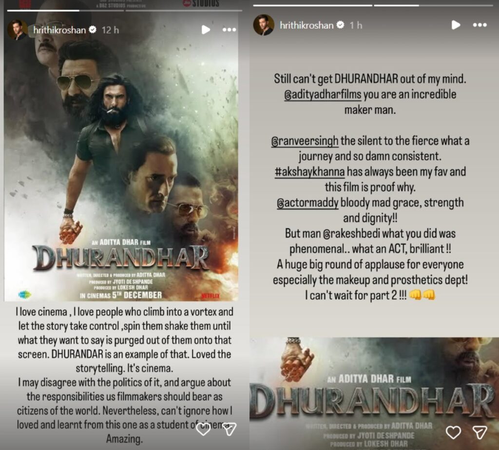 Taking to his story section on Instagram, Hrithik first said: “I love cinema, I love people who climb into a vortex and let the story take control, spin them shake them until what they want to say is purged out of them onto that screen. DHURANDAR is an example of that. Loved the storytelling. It’s cinema.”