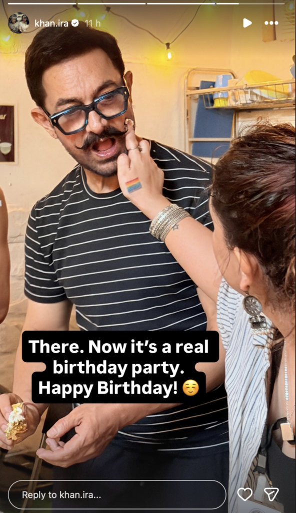 Immediately after Aamir had cut the cake, Ira decided to put some other cake on her father’s face as a mark of celebration. She uploaded another still on her Insta Stories of putting the cake on Aamir’s face. What made the picture even more adorable was the expression of the ‘3 Idiots’ actor.