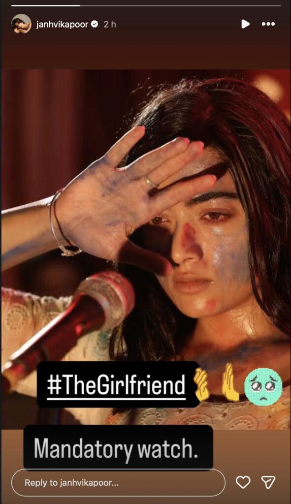 Janhvi took to Instagram, where she shared a story featuring a pivotal scene from the film featuring Rashmika. She captioned it with “#TheGirlfriend. Mandatory Watch.”