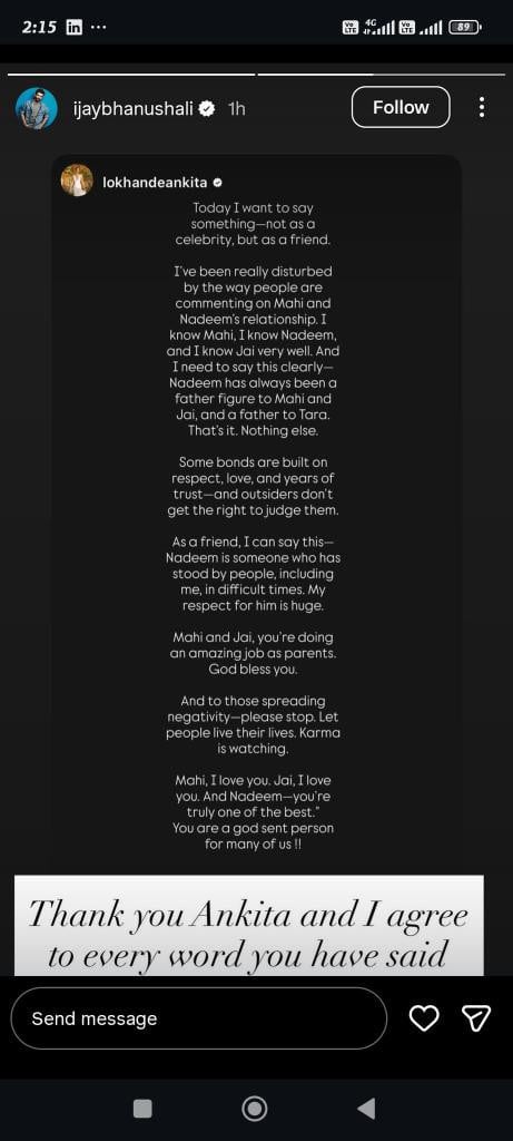 Actress Ankita Lokhande later stepped in to clear the air, strongly defending Mahhi and Nadim. In an Instagram story, Ankita stated that Nadim has always been a father figure to both Mahhi and Jay, and a father to their daughter Tara, shutting down all rumours.