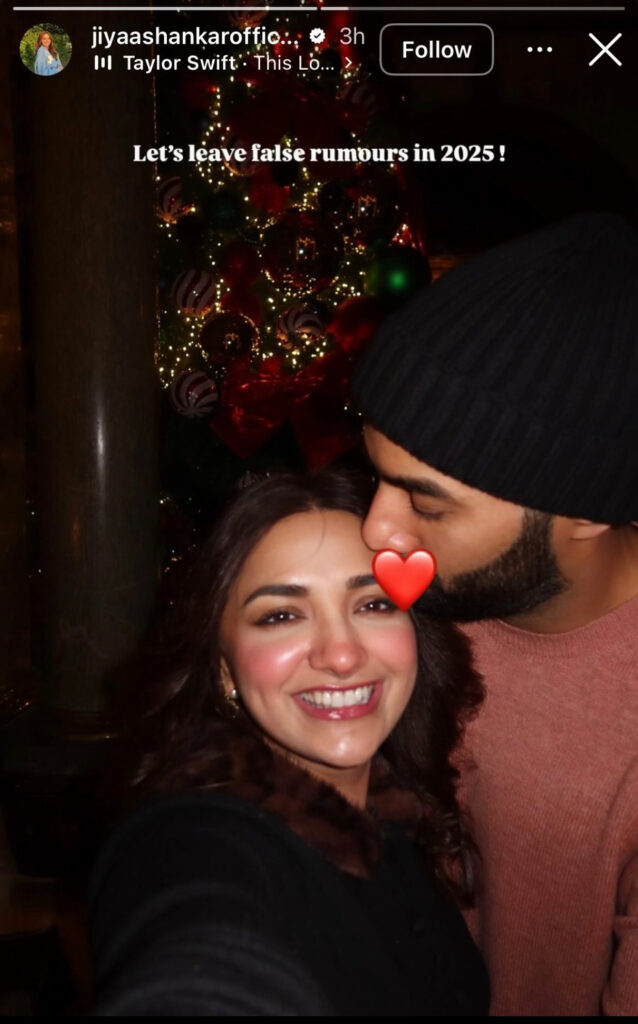 On Wednesday, the actress took to her Instagram stories to share a selfie with a man whose identity she chose not to reveal. In the picture, the mystery man is seen kissing Jiya on the cheek. Sharing the photo, Jiya wrote, “Let’s leave false rumours in 2025!”, making it clear that she is neither engaged to nor dating Abhishek Malhan.