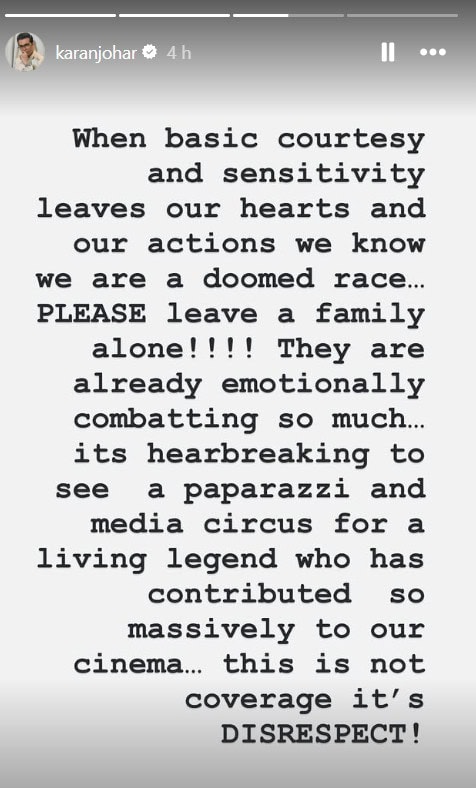 The veteran director emphasized the importance of respecting an artist’s privacy and emotions, especially during sensitive times. On Thursday, Karan took to his Instagram Stories to share a note addressing the ongoing invasion of privacy faced by the Deol family. He expressed concern over the emotional stress they were going through and urged people to respond with empathy and kindness during this difficult period.