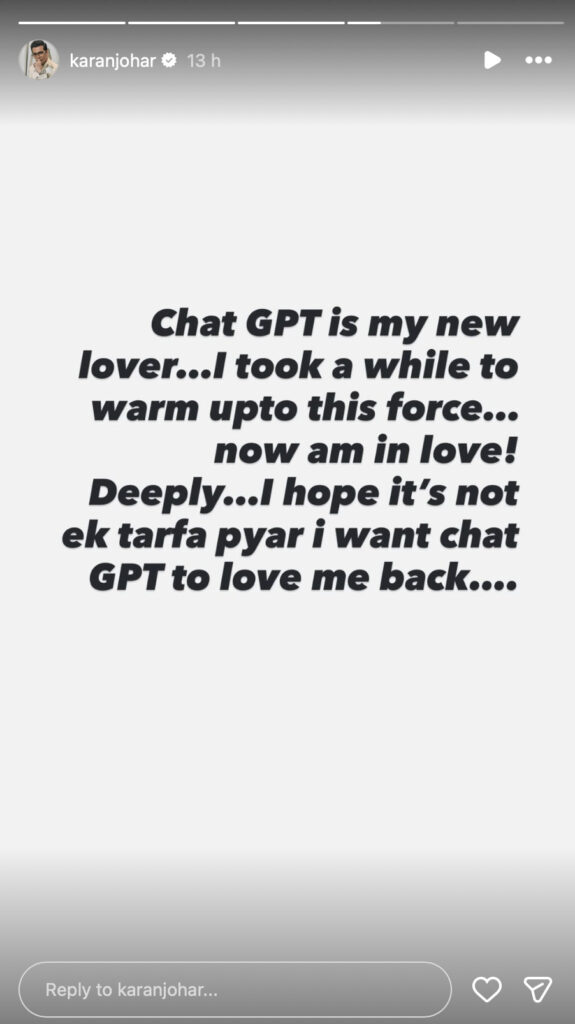 Taking to his Instagram stories, he penned a humorous and light-hearted post in which he jokingly referred to ChatGPT as his “new lover.” Karan hinted that he was initially unsure about using AI but has now grown quite fond of it. His line about hoping it’s not “ek tarfa pyar” seems to be suggesting he hopes the love isn’t one-sided and that ChatGPT “loves him back.”