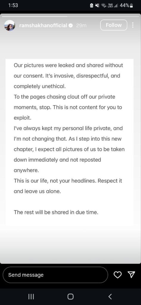 Confirming her wedding and putting an end to the ongoing speculation, Ramsha expressed her anger over the breach of privacy. “Our pictures were leaked and shared without our consent. It’s invasive, disrespectful, and completely unethical. To the pages chasing clout off our private moments, stop. This is not content for you to exploit,” she wrote.
