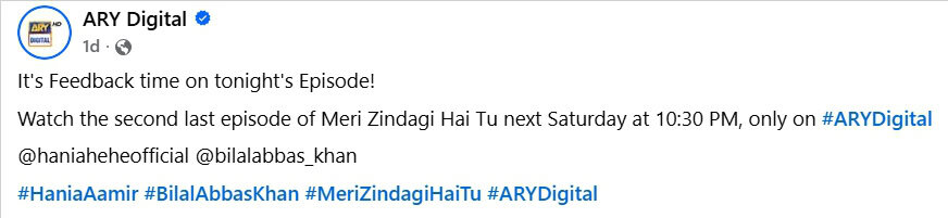 The dates for the final episodes are now out. The second-last episode of Meri Zindagi Hai Tu has been officially announced by ARY Digital and will air next Saturday, March 14. The grand finale episode is likely to be aired on March 27 or 28. Notably, Eid in India and Pakistan is expected to fall around March 21.