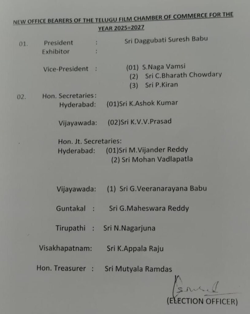 Producer Suryadevara Naga Vamsi has been elected as Vice President. He represents the new generation of Telugu cinema producers and is known for backing modern, content-driven films and supporting fresh talent. His work is often associated with innovative marketing and strong audience connect, especially among younger viewers. Bharat Chowdary was also elected as Vice President, and Gemini Kiran was elected Vice President from the studio sector.