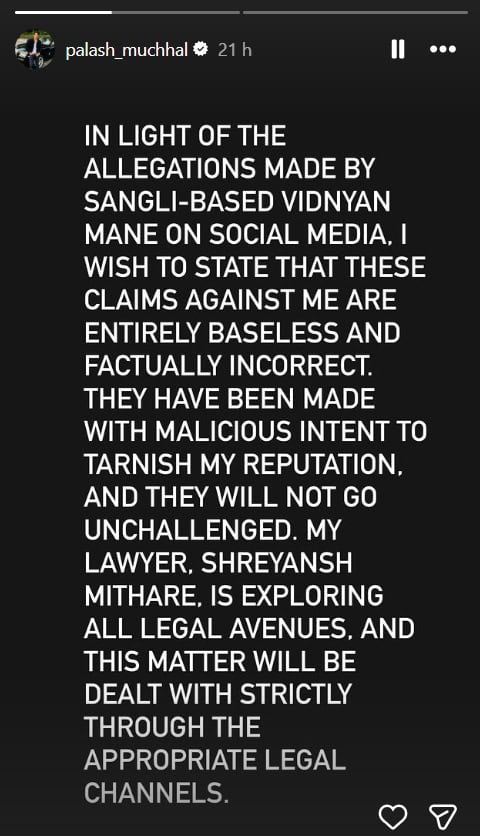 Responding to the allegations, Palash Muchhal issued a statement on Instagram, calling the claims “baseless and factually incorrect.”