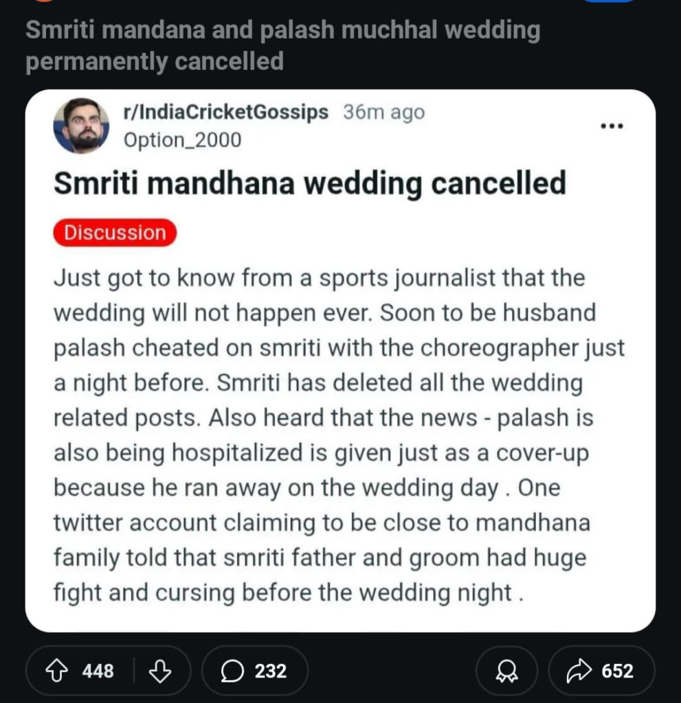 The leaked chats also showed Palash telling the woman that his long-distance relationship with finacee Smriti Mandhana felt “dead most of the time” and that they met only once every few months. After these screenshots surfaced, several Reddit users claimed that Palash had also been seen kissing a woman during dance rehearsals four days before the engagement. While none of these allegations are confirmed, the viral posts have created a massive buzz online.