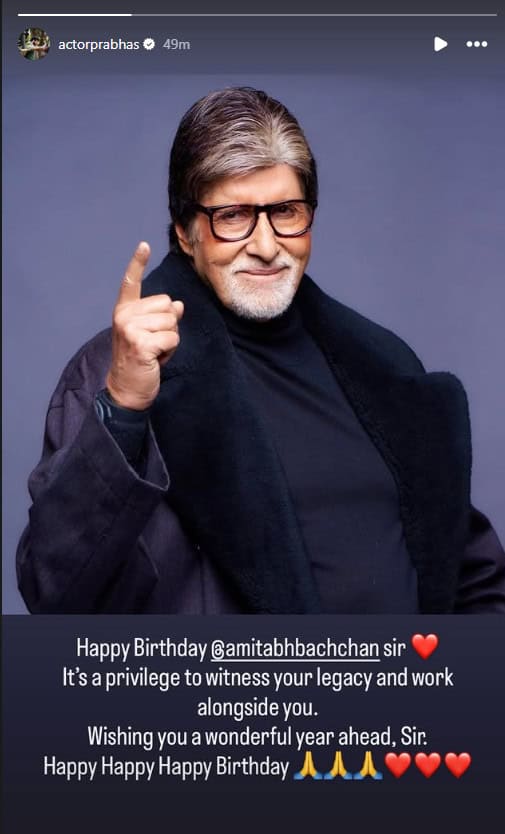Taking to his Instagram stories section, actor Prabhas wrote, “Happy birthday @amitabhbachchan sir. It’s a privilege to witness your legacy and work alongside you. Wishing you a wonderful year ahead, Sir. Happy Happy Happy Birthday.”