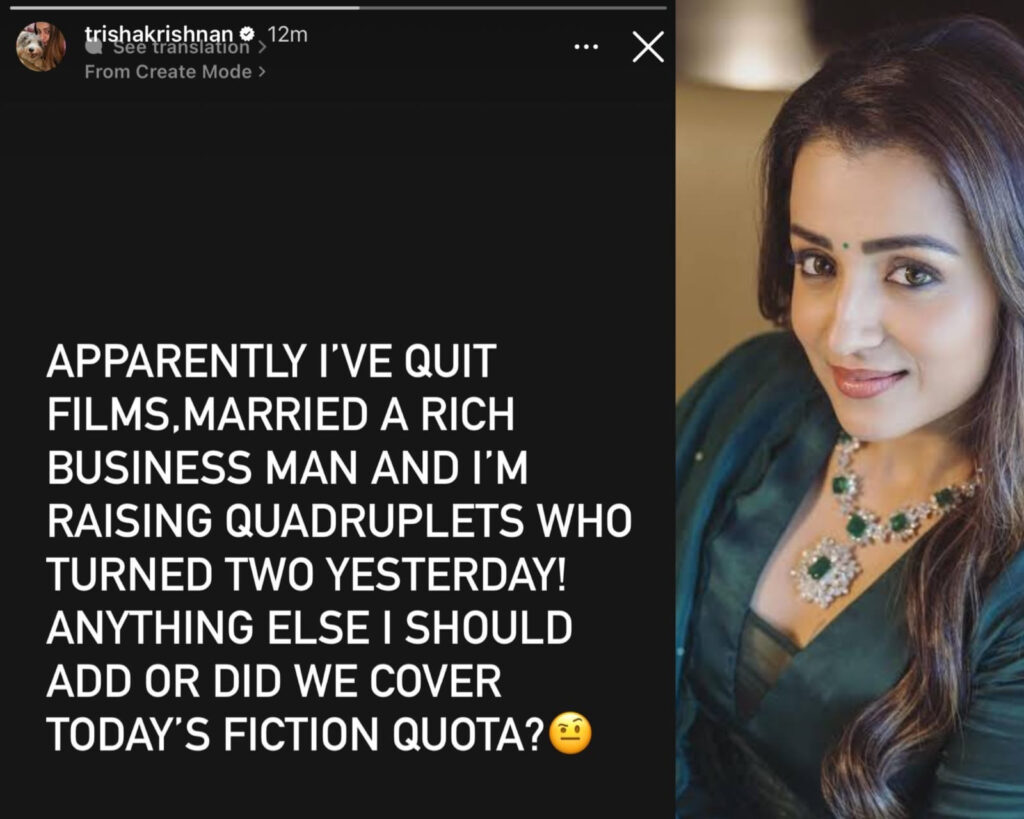 Taking to Instagram, Trisha shared a story reacting to the rumours and sarcastically questioned the ongoing speculation. She wrote, “Apparently I’ve quit films. Married a rich businessman and I’m raising quadruplets who turned two yesterday! Anything else I should add or did we cover today’s fiction quota?” Her response has since gone viral on social media.
