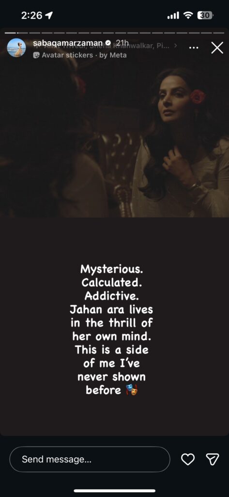 Saba Qamar also shared the teaser on her Instagram stories, describing the project as “mysterious, addictive, and calculated,” promising a completely unseen side of her acting journey. She further hinted that Jahan Ara “lives in the thrill of her own mind,” suggesting a layered and psychologically complex role.