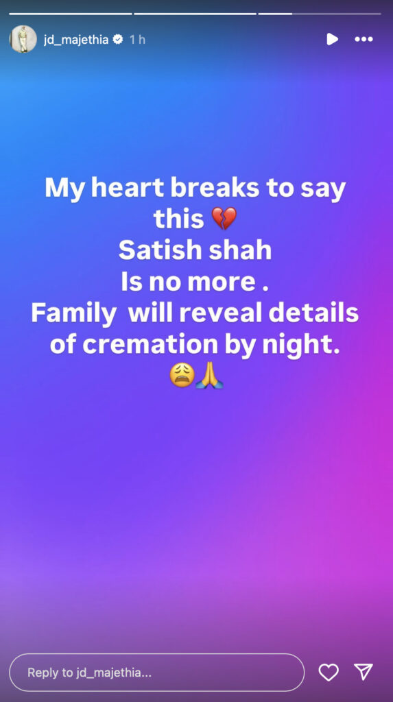 Expressing his grief, JD penned on his Insta Stories, “My heart breaks to say this (broken heart emoji). Satish Shah is no more. Family will reveal details of the cremation by night. (Crying face and folded hands emoji) (sic).”