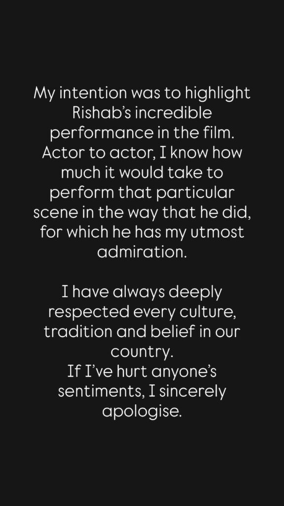 As the backlash grew, Ranveer posted an apology on Instagram. He wrote that he only wanted to appreciate Rishab’s performance and never intended to hurt anyone. He wrote, “My intention was to highlight Rishabh’s incredible performance in the film. Actor to actor, I know how much it would take to perform that particular scene in the way that he did, for which he has my utmost admiration.”