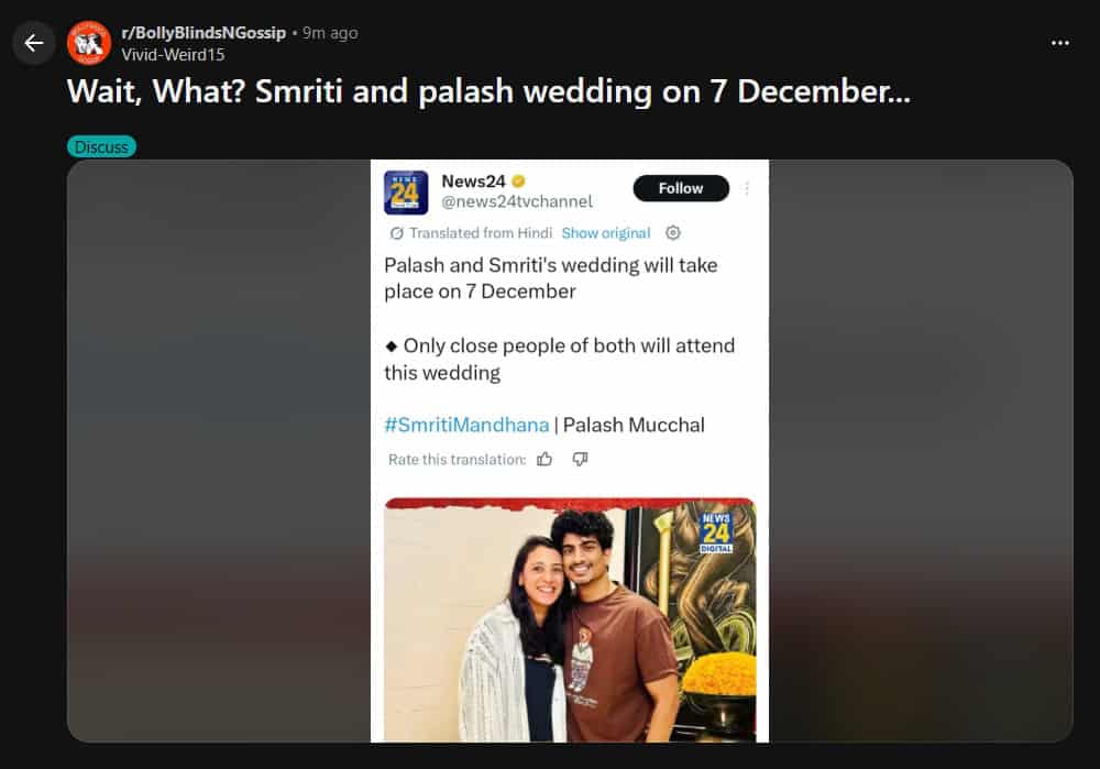 Amid ongoing chatter about the wedding being cancelled, a new rumour has taken over social media. According to a report by News 24, Smriti and Palash are now expected to tie the knot on December 7, with the ceremony said to be an extremely private affair attended only by close family members.